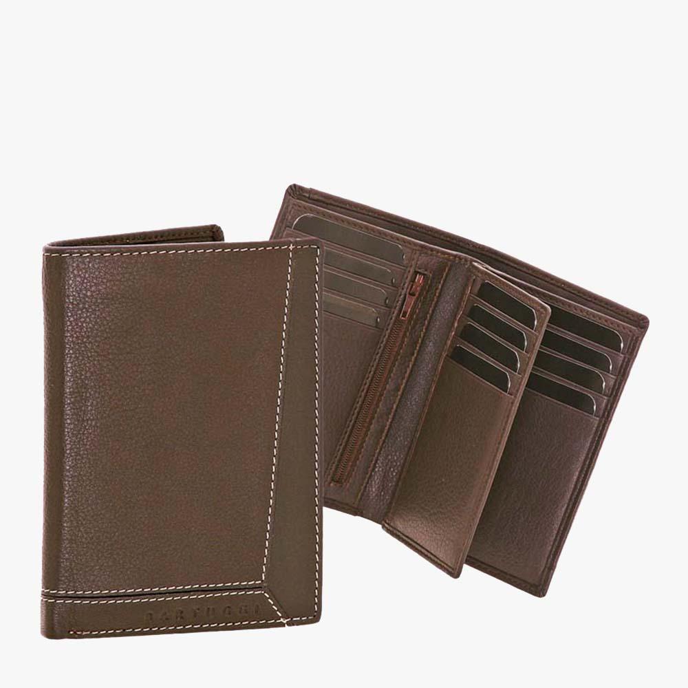 Δερμάτινο, όρθιο ανδρικό πορτοφόλι BARTUGGI με 12 θέσεις για κάρτες, 2 θέσεις για χαρτονομίσματα και 8 επιπλέον εσωτερικές θήκες για ταυτότητα, δίπλωμα, κλπ. εκ των οποίων η μια ασφαλίζει με φερμουάρ.