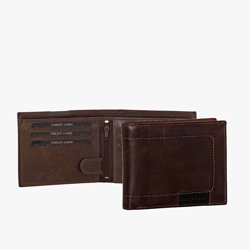 Δερμάτινο ανδρικό πορτοφόλι BARTUGGI με λεπτομέρειες από γάζι, που είναι η ιδανική επιλογή για αυτούς που αναζητούν στυλ και λειτουργικότητα. Διαθέτει δύο θέσεις για χαρτονομίσματα, θήκη για κέρματα, οκτώ υποδοχές για κάρτες και πέντε επιπλέον θήκες, εκ των οποίων οι δύο κλείνουν με φερμουάρ.