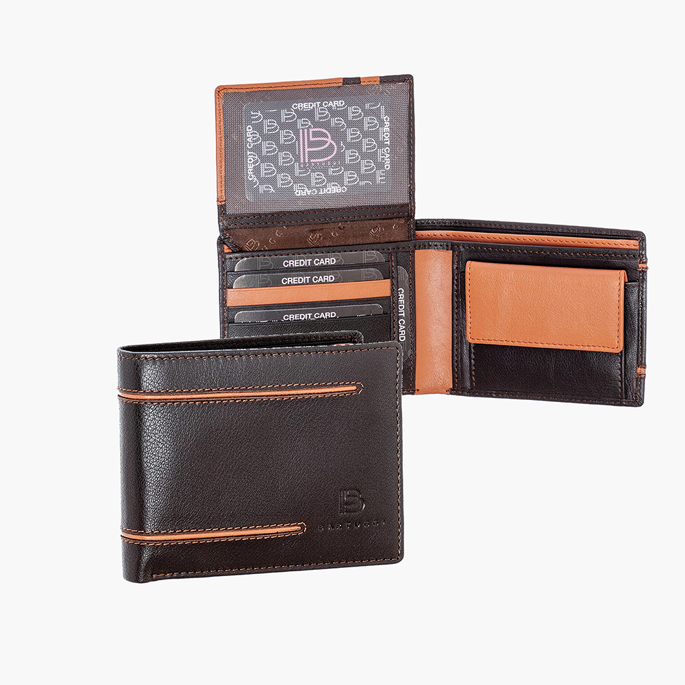 Κομψό δερμάτινο ανδρικό πορτοφόλι της Bartuggi, διακοσμημένο με διακριτικές χρωματιστές λεπτομέρειες που του δίνουν μια ξεχωριστή εμφάνιση. Διαθέτει 2 πρακτικές θέσεις για χαρτονομίσματα, τσέπη για κέρματα με καπάκι, 10 θέσεις για κάρτες και 5 επιπλέον θήκες για ταυτότητα, δίπλωμα ή φωτογραφίες. Προσφέρει υψηλή ασφάλεια χάρη στην προστασία RFID, ενώ παραδίδεται σε καλαίσθητο κουτί δώρου, καθιστώντας το εξαιρετική επιλογή για εσάς ή για ένα αγαπημένο σας πρόσωπο.