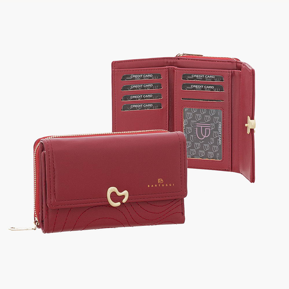 Ένα κομψό πορτοφόλι της BARTUGGI κατασκευασμένο από δερματίνη, με ανάγλυφο μοτίβο και ιδιάιτερο κλείσιμο σε σχήμα καρδιάς με μεταλλική ανάγλυφη καρδούλα. Διαθέτει εξωτερική θήκη για κέρματα με 2 θέσεις, που κλείνει με φερμουάρ, εσωτερική θήκη για χαρτονομίσματα, 7 υποδοχές για κάρτες για καλύτερη οργάνωση και 2 επιπλέον θήκες για ταυτότητα ή δίπλωμα οδήγησης και άλλα προσωπικά έγγραφα.