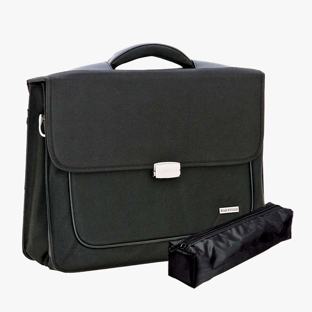Πρακτικός και ανθεκτικός χαρτοφύλακας BARTUGGI από αδιάβροχο ύφασμα με 2 εσωτερικές θέσεις εκ των οποίων η μια είναι για laptop, κατάλληλες για μεταφορά εγγράφων Α4. Διαθέτει μια τσέπη κάτω από το καπάκι με θήκη για κινητό, θέσεις για στυλό, κάρτες, κλπ, ειδική κασετίνα για τα αξεσουάρ του υπολογιστή και μια τσέπη με φερμουάρ στο πίσω μέρος, η οποία χρησιμέυει και σαν ιμάντας για να στερεώνεται πάνω στη λαβή της βαλίτσας σας όταν ταξιδέυετε. Διαθέτει ιμάντα ώμου. Διαστάσεις: 43 x 33 x12 εκ.