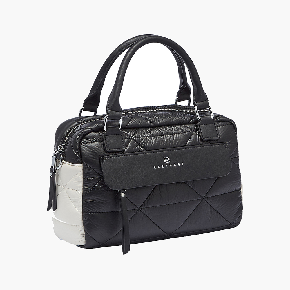 Δίχρωμη, ευρύχωρη και πρακτική τσάντα ώμου βαρελάκι από την Bartuggi, που μπορεί να φορεθεί και ως χιαστί. Έχει κομψό συνδυασμό χρωμάτων και πρωτοποριακό υλικό με εξαιρετικά απαλή υφή σε καπιτονέ pattern, κάνοντάς την ιδανική για καθημερινή χρήση. Εσωτερικά διαθέτει 3 τσέπες, με τη μία να κλείνει με φερμουάρ για μεγαλύτερη ασφάλεια. Εξωτερικά, περιλαμβάνει 1 τσέπη μπροστά κάτω από το καπάκι με φερμουάρ, καθώς και 1 τσεπάκι πίσω με φερμουάρ. Η τσάντα συνοδεύεται από φανέλα αποθήκευσης και προσαρμοζόμενο ιμάντα για να την προσαρμόσετε άνετα στο μήκος που σας βολεύει.