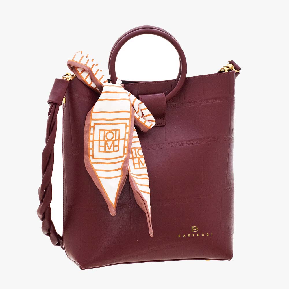 Εντυπωσιακή τσάντα BARTUGGI με διακοσμητικό μαντήλι, στρογγυλά χεράκια προσαρμοσμένα στο σώμα της τσάντας και επιπλέον ιμάντα ώμου με ιδιάιτερη πλέξη, ιδανική για θηλυκές εμφανίσεις.
