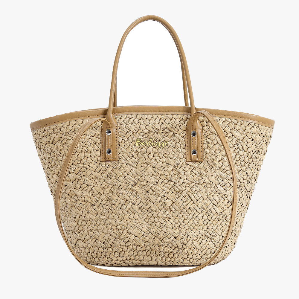 Ιδιαίτερη τσάντα ψάθινη με λεπτομέρειες από δερματίνη, που σουρώνει, έχει επιπλέον 2 χεράκια για να φοριέται στον ώμο και έχει εσωτερικό τσεπάκι. Ιδανική για όλη την ημέρα.
