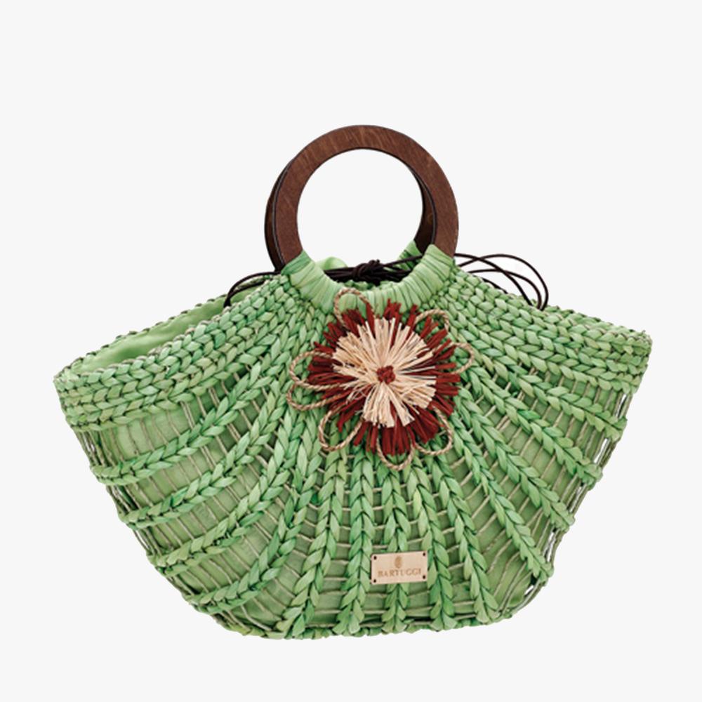 Ιδιαίτερη τσάντα μπάνιου με κοκκάλινο στρογγυλό χεράκι και διακοσμητικό λουλούδι που φοριέται και σαν τσάντα χειρός. Σουρώνει από επάνω και είναι ιδανική για όλη την ημέρα.